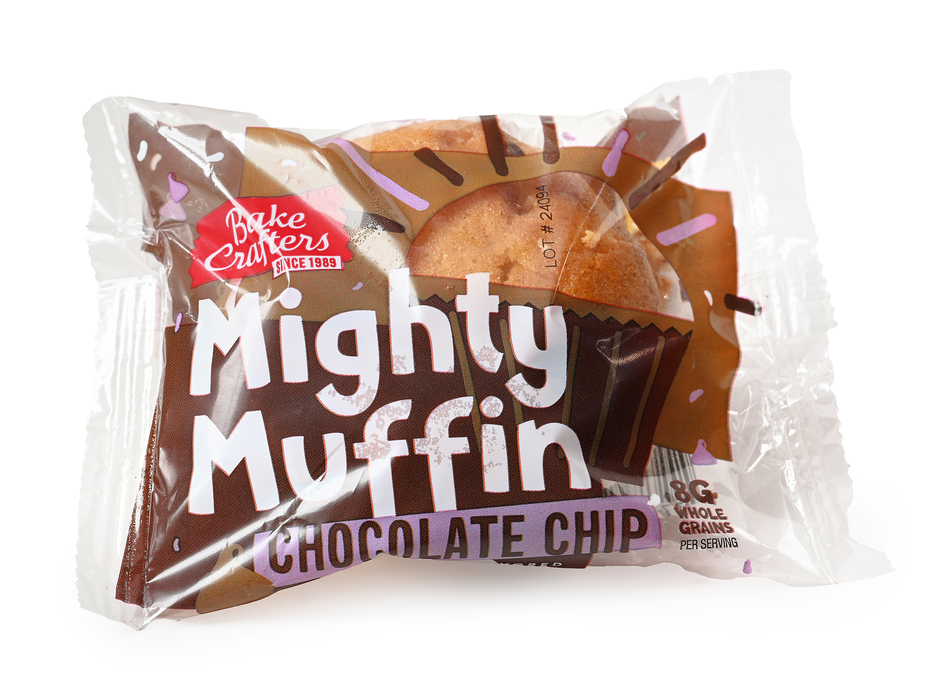 Bake Crafters Muffins, WG, Chocolate Chip, RF, IW, Retail; must be whole grain rich and provide 1.0 ounce grain equivalent. Portion to provide at least 145 calories, with no more than 6 grams of fat. Must contain less than 150 milligrams of sodium. Acceptable brand: Bake Crafters 1204.
