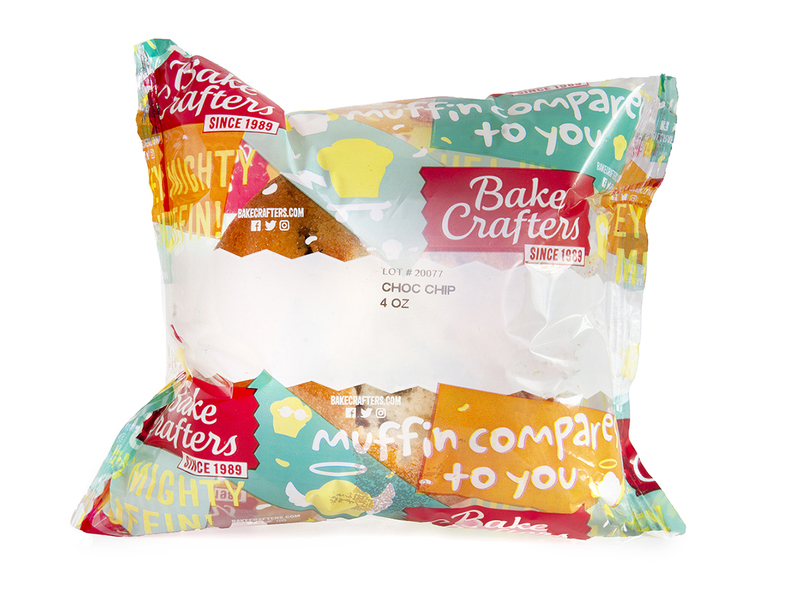 Bake Crafters Muffins, Chocolate Chip, IW; must provide 1.75 ounce grain equivalents. Portion to provide at least 345 calories, with no more than 14 grams of fat. Must contain less than 360 milligrams of sodium. Acceptable brand: Bake Crafters 1545.