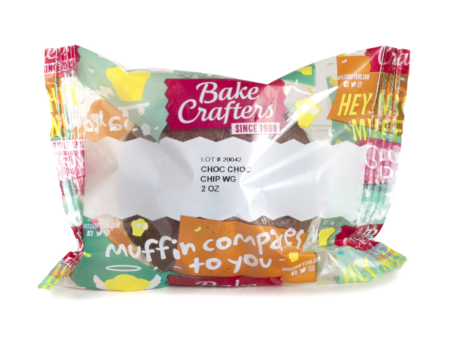 Bake Crafters Muffins, WG, Chocolate Chocolate Chip, RF, IW; must be whole grain rich and provide 1.0 ounce grain equivalent. Portion to provide at least 135 calories, with no more than 6 grams of fat. Must contain less than 100 milligrams of sodium. Acceptable brand: Bake Crafters 2156.