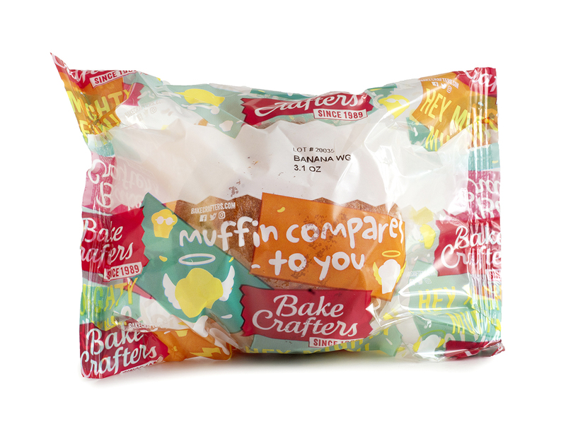 Bake Crafters Muffins, WG, Banana, IW; must be whole grain rich and provide 2.0 ounce grain equivalents. Portion to provide at least 225 calories, with no more than 8 grams of fat. Must contain less than 200 milligrams of sodium. Acceptable brand: Bake Crafters 2166.