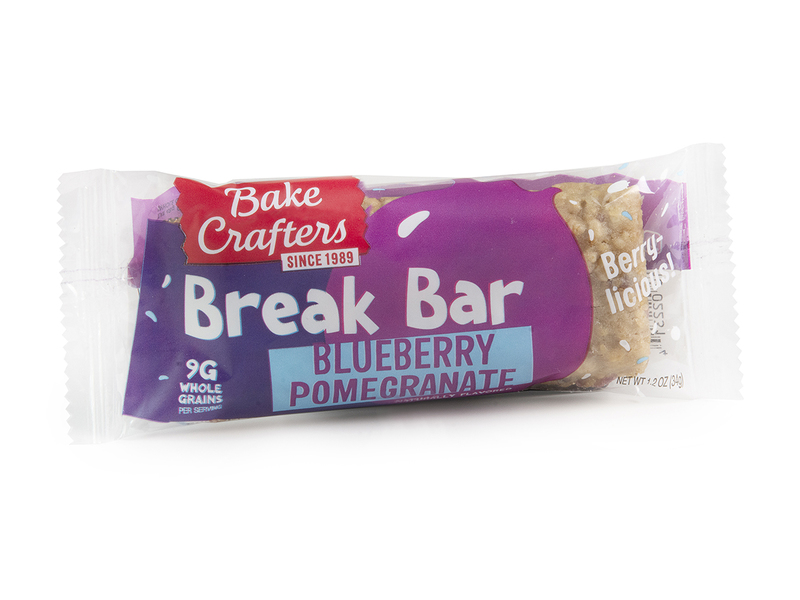 Bake Crafters INACTIVE - Break Bar, Blueberry Pomegranate, WG, IW; must be whole grain rich and provide 1.0 ounce grain equivalent. Portion to provide at least 115 calories, with no more than 5.5 grams of fat. Must contain less than 135 milligrams of sodium. Acceptable brand: Bake Crafters 2231.