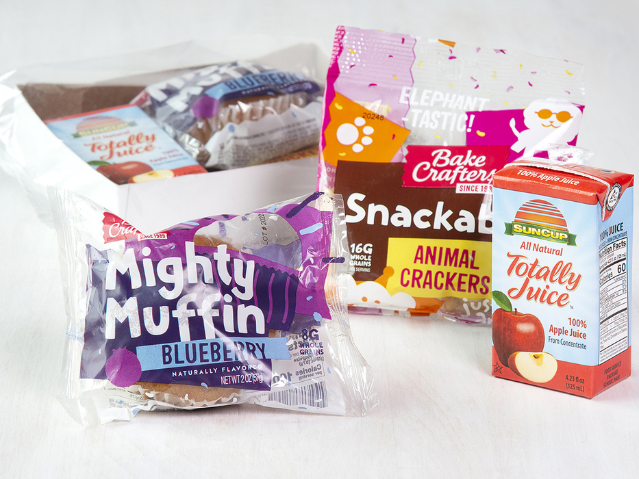 Bake Crafters INACTIVE - Meal Kit, Muffin Blueberry, WG, Animal Crackers, Apple Juice; must be whole grain rich and provide 2.0 ounce grain equivalents and 0.5 cups of fruits/vegetables. Portion to provide at least 325 calories, with no more than 10 grams of fat. Must contain less than 245 milligrams of sodium. Acceptable brand: Bake Crafters 2912.