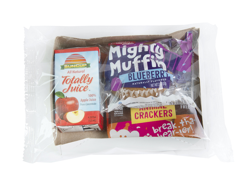 No time for meal planning? Why not try our blueberry muffin meal kit? It contains a whole grain blueberry muffin, animal crackers and apple juice. It's great for either breakfast or as a mid-day snack. Packed in its own tray, it's perfect for classroom serving or for sending home with students.