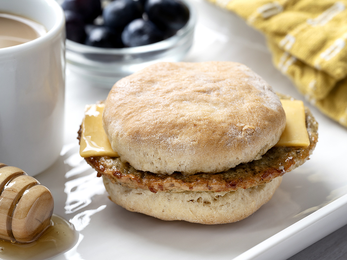 Whole Grain Honey Wheat Biscuit: Water, Whole Wheat Flour, Enriched Wheat Flour (Wheat Flour, Malted Barley Flour, Niacin, Reduced Iron, Thiamine Mononitrate, Riboflavin, Folic Acid), Palm Oil, Buttermilk, Honey, Sugar, Shortening Flakes (Palm Oil, Soy Lecithin, Natural Butter Flavor, Beta Carotene), Contains 2% Or Less Of The Following: Baking Powder (Sodium Acid Pyrophosphate, Sodium Bicarbonate, Cornstarch, Monocalcium Phosphate), Wheat Gluten, Flaxseed Meal, Salt, Guar Gum, Fumaric Acid, Hydrogenated Soybean Oil, Potassium Sorbate. Chicken Sausage: Chicken, Water, Seasoning (Salt, Spices, Dextrose, Sugar). Yellow Cheese: Cultured Skim Milk, Water, Sodium Citrate, Salt, Potassium Citrate, Annatto and Paprika (Color), Cream, Sorbic Acid (Preservative), Enzymes, Soy Lecithin.
