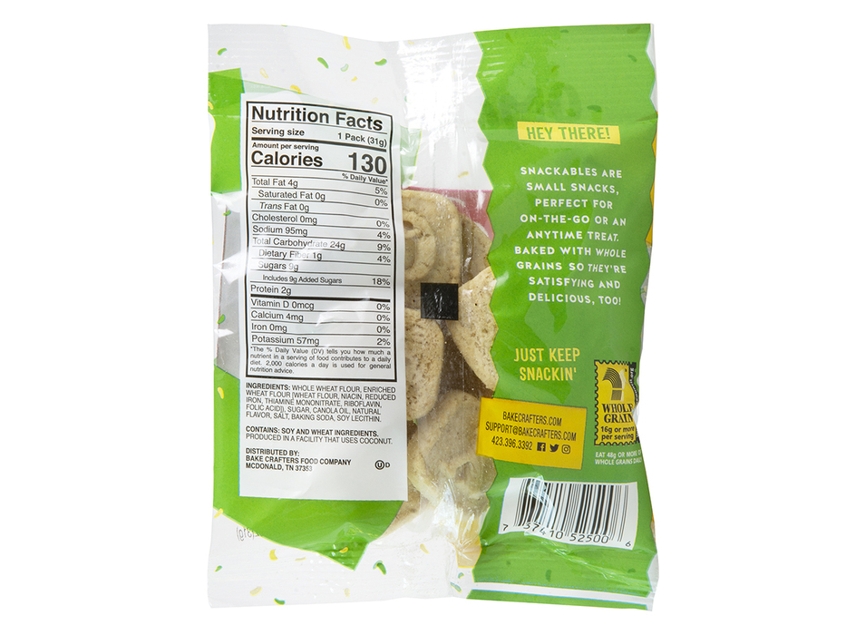 Bake Crafters INACTIVE - Snackables, Alphabet, WG, Packs; must be whole grain rich and provide 1.25 ounce grain equivalents. Portion to provide at least 105 calories, with no more than 5 grams of fat. Must contain less than 145 milligrams of sodium. Acceptable brand: Bake Crafters 525.