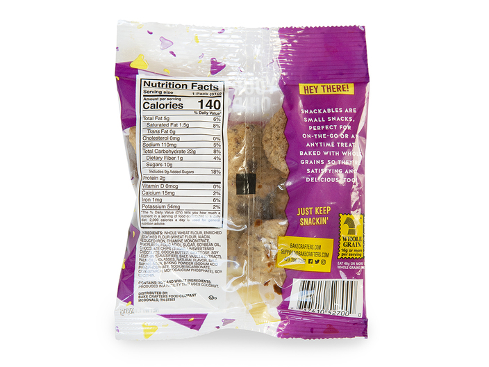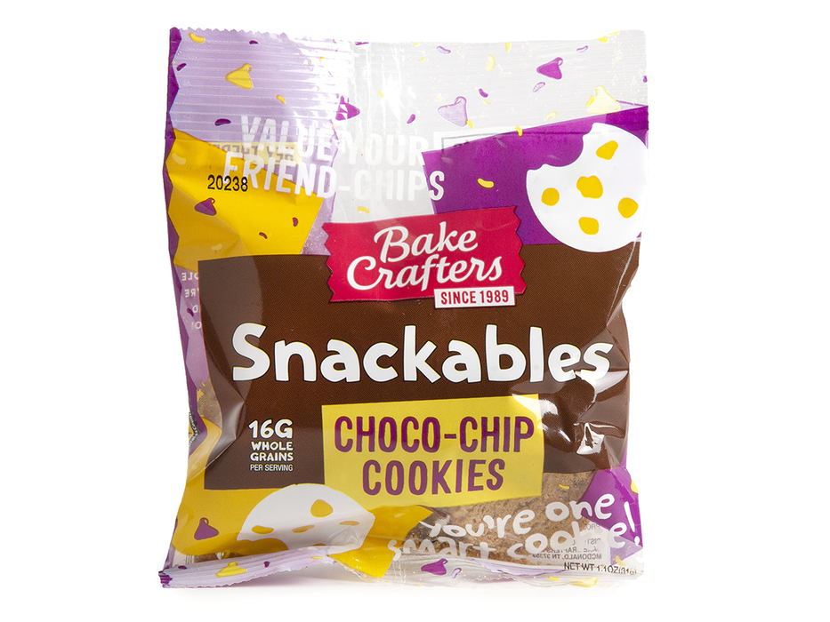 Bake Crafters INACTIVE - Snackables, Chocolate Chip Cookies, WG, Packs; must be whole grain rich and provide 1.0 ounce grain equivalent. Portion to provide at least 115 calories, with no more than 6 grams of fat. Must contain less than 160 milligrams of sodium. Acceptable brand: Bake Crafters 527.