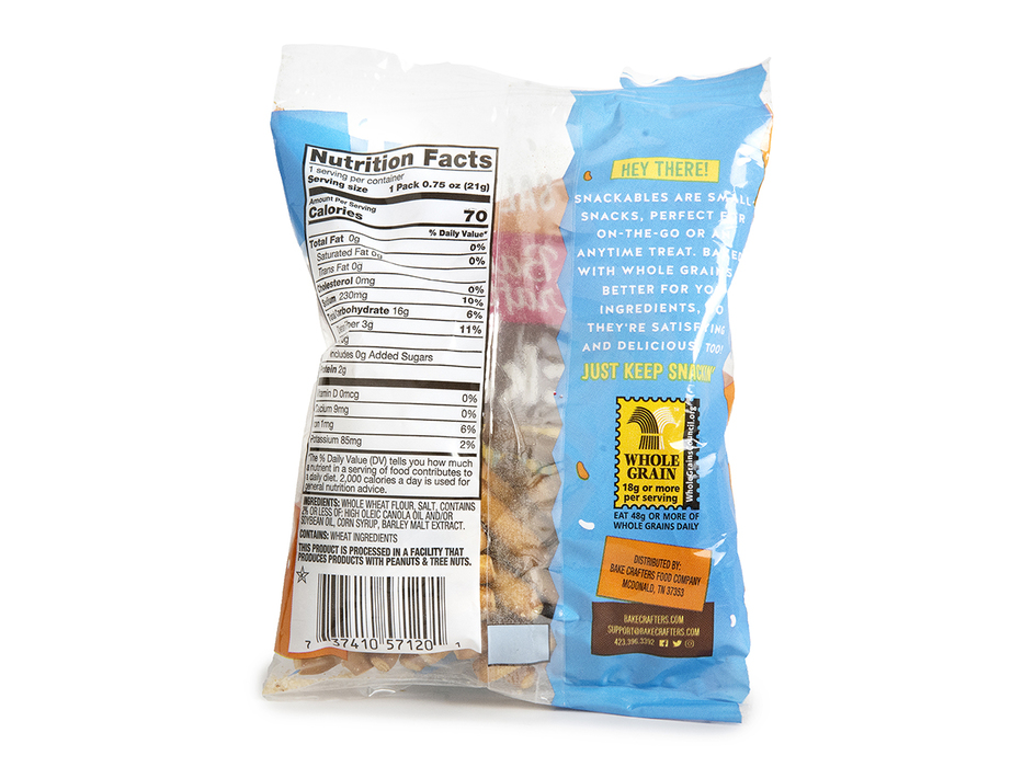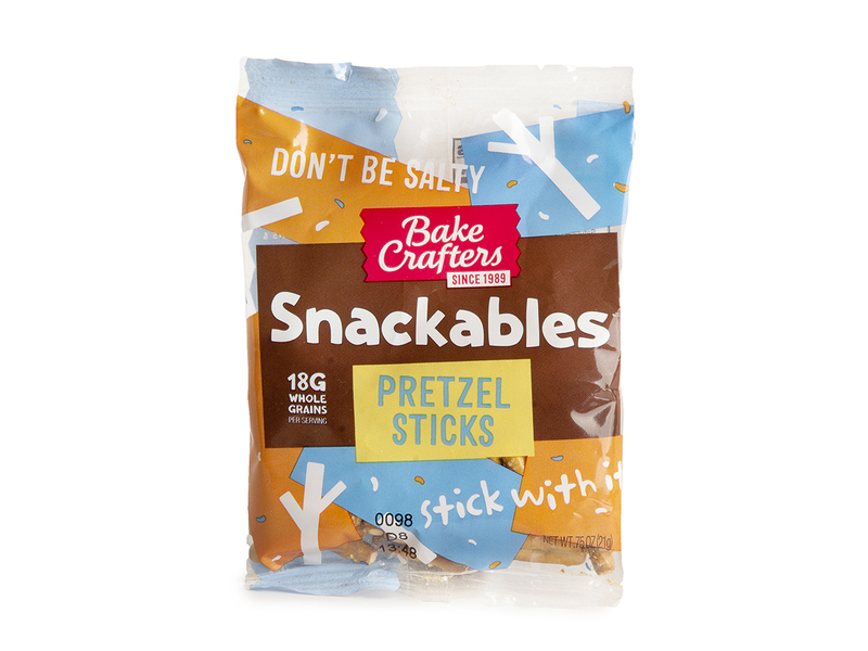 Bake Crafters INACTIVE - Snackables, Pretzel Sticks, WG, Packs; must be whole grain rich and provide 1.0 ounce grain equivalent. Portion to provide at least 55 calories, with no more than 1.5 grams of fat. Must contain less than 280 milligrams of sodium. Acceptable brand: Bake Crafters 5712.