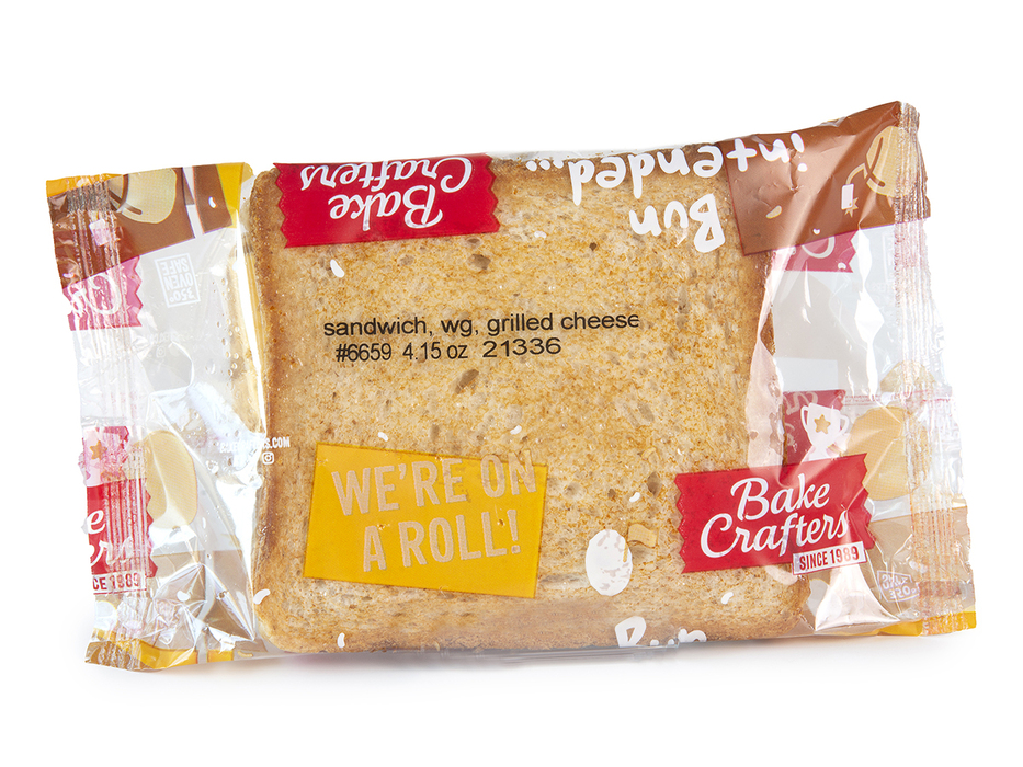 Bake Crafters Sandwich, WG, Grilled Cheese, IW; must be whole grain rich and provide 2.0 ounce grain equivalents and 2.0 ounces of meat or meat alternate. Portion to provide at least 295 calories, with no more than 18 grams of fat. Must contain less than 770 milligrams of sodium. Acceptable brand: Bake Crafters 6659.