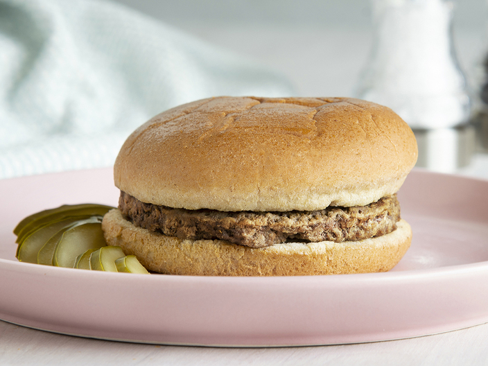 Looking for something fun for lunch? Try our burger on a whole grain bun. Packaged in convenient ovenable film, each 100% beef hamburger provides 2 grain equivalents and 2 protein equivalents. Excellent alone or with added toppings. Produced in a nut-free facility.