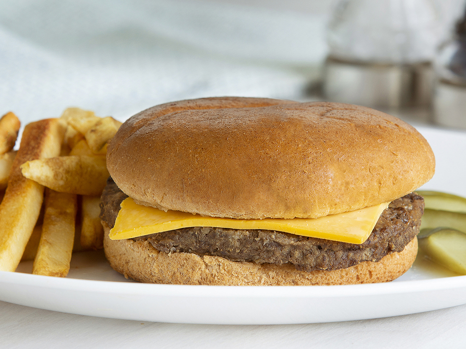 If you like cheeseburgers, then we know you'll love ours! Packaged in convenient ovenable film, each 100% beef cheeseburger provides 2 grain equivalents and 2.5 protein equivalents. Excellent alone or with added toppings. Produced in a nut-free facility.