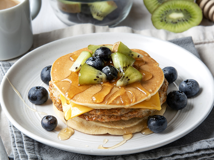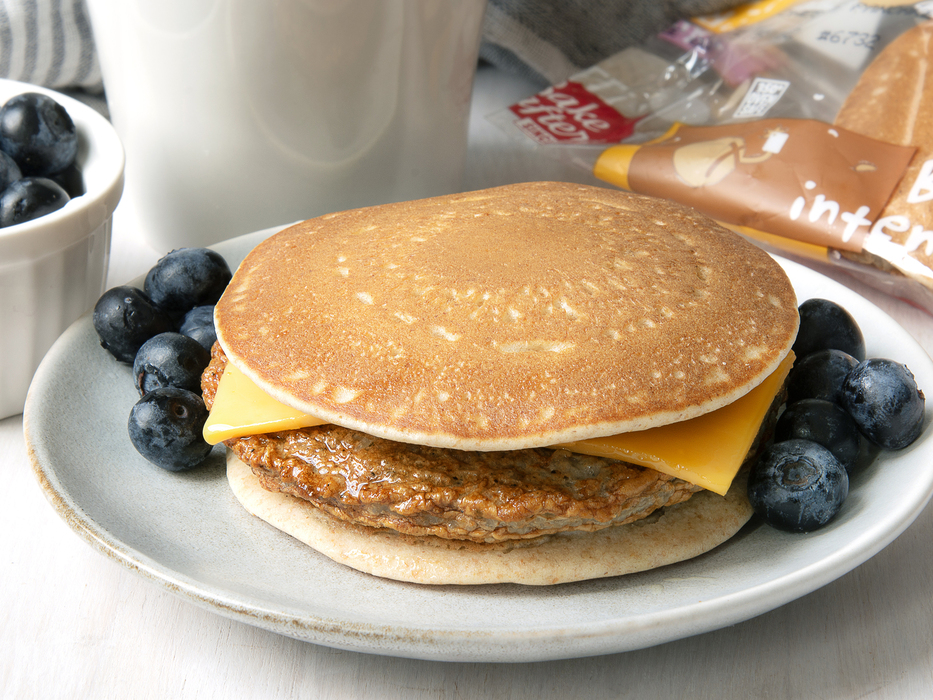Need more than just pancakes for breakfast? How about a delicious pancake sandwich with chicken sausage and cheese? The delicious flavor combinations are sure to satisfy. Wrapped in an oven-safe package, all you need to do is heat and serve!