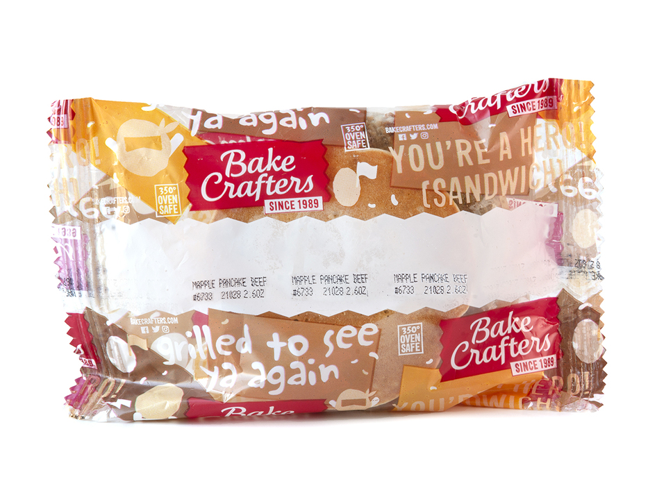 Bake Crafters INACTIVE - Sandwich, Maple Pancake, WG, Beef Sausage, IW; must be whole grain rich and provide 1.0 ounce grain equivalent and 1.0 ounce of meat or meat alternate. Portion to provide at least 135 calories, with no more than 6 grams of fat. Must contain less than 390 milligrams of sodium. Acceptable brand: Bake Crafters 6733.