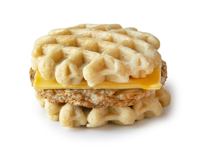Waffle: Whole Wheat Flour Blend (Whole Wheat Flour, Enriched Wheat Flour [Wheat Flour, Niacin, Reduced Iron, Thiamine Mononitrate, Riboflavin, Folic Acid], Water, Soybean Oil, Maple Chips (Sugar, Wheat Flour, Canola Oil, Yellow Corn Flour, Dextrose, Natural Flavor, Sunflower Lecithin), Brown Sugar, Nonfat Milk. Contains 2% or less of: Soy Lecithin, Baking Powder (Sodium Bicarbonate, Corn Starch, Sodium Acid Pyrophosphate, Mono Calcium Phosphate), Egg, Salt. Chicken Sausage: Chicken, Water, Seasoning (Salt, Spices, Dextrose, Sugar). Yellow Cheese: Cultured Skim Milk, Water, Sodium Citrate, Salt, Potassium Citrate, Annatto and Paprika (Color), Cream, Sorbic Acid (Preservative), Enzymes, Soy Lecithin.