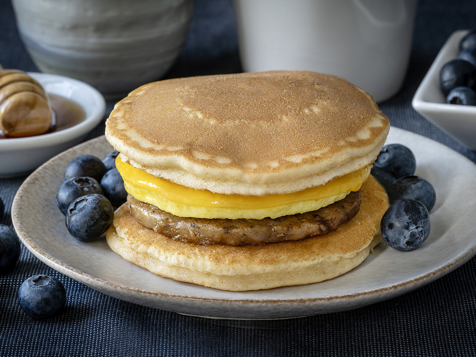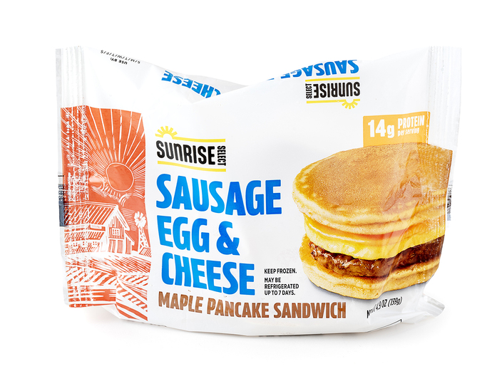 This individually wrapped classic breakfast sandwich includes a savory sausage patty, a fluffy egg, and melted cheese, all stacked between two sweet maple pancakes. It's fully cooked, high in protein, and ready to enjoy in minutes.