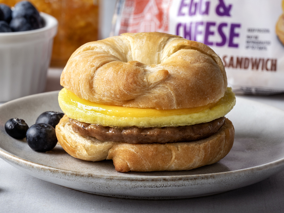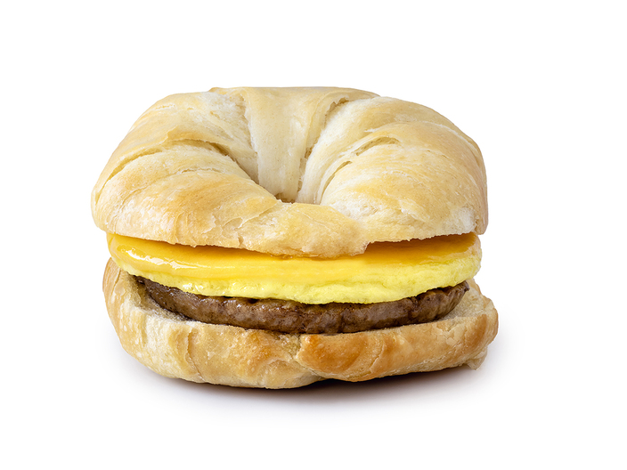Our sausage, egg, and cheese croissant breakfast sandwich combines a savory sausage patty, a fluffy egg, and melted cheese inside a buttery, flaky croissant. Individually wrapped for easy preparation, it's a convenient and tasty option for breakfast or a quick snack.