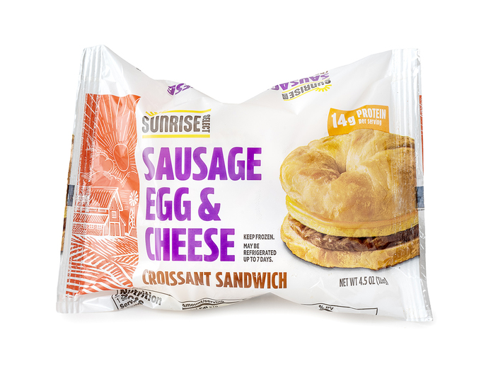 Bake Crafters Sunrise Select, Croissant Sandwich, Sausage, Egg, Cheese, IW. Portion to provide at least 325 calories, with no more than 22 grams of fat. Must contain less than 850 milligrams of sodium. Acceptable brand: Bake Crafters 8603.