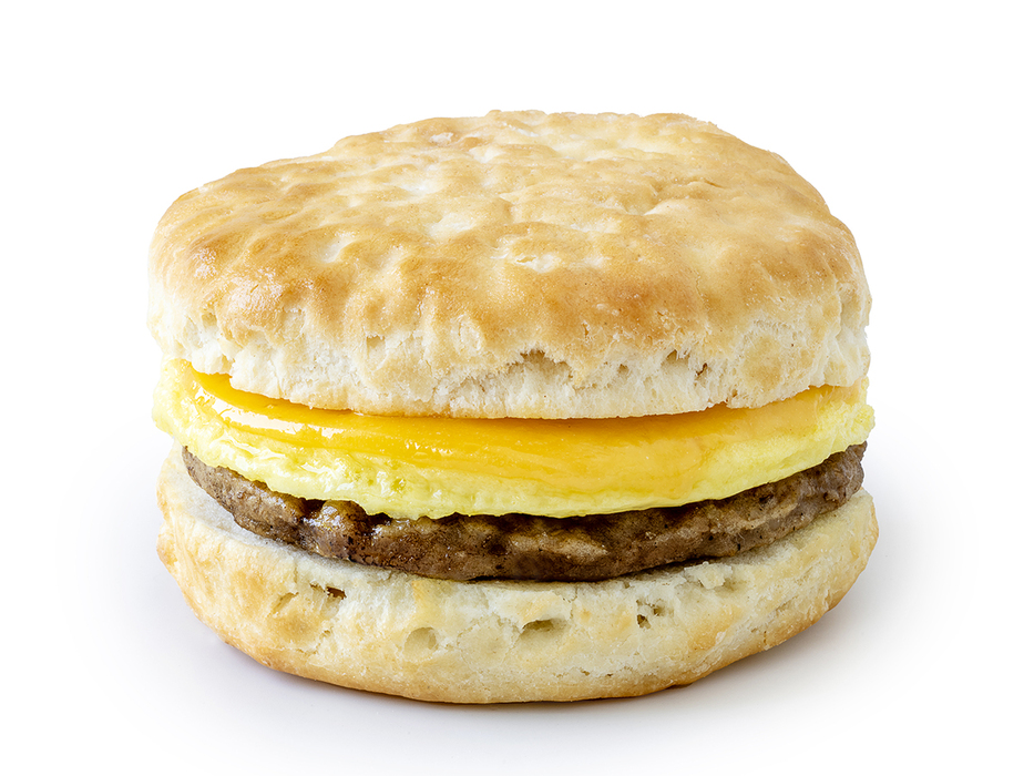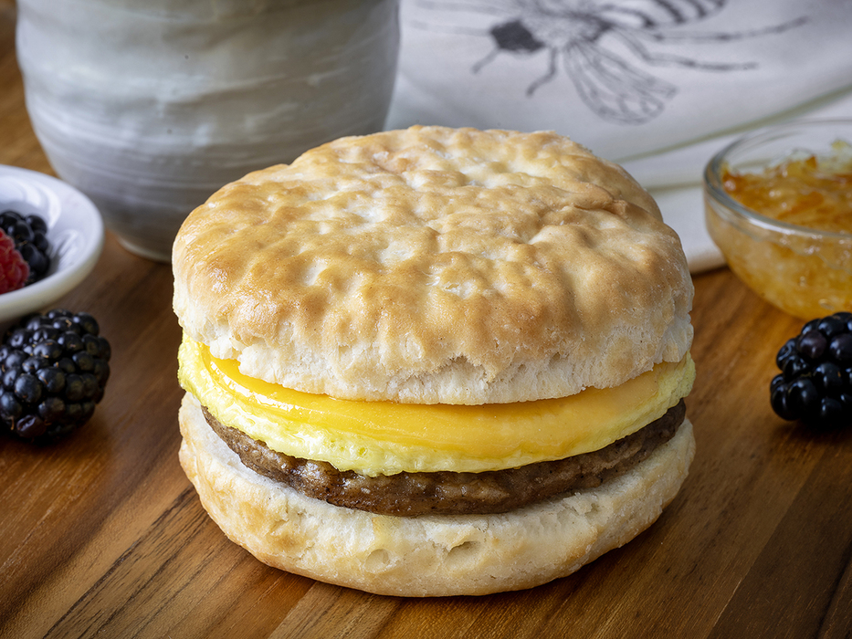 Our sausage, egg, and cheese biscuit sandwich offers a hearty breakfast with a savory sausage patty, a fluffy egg, and melted cheese on a soft, flavorful biscuit. Individually wrapped for convenience, it's the perfect way to start your morning.